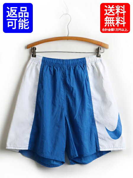 90s ■ NIKE ナイキ 2トーン ビッグ スウッシュ プリント ナイロン ショートパンツ ( 男性 メンズ L ) 古着 短パン 半パン ショーツ 青 白| 【US古着】 中古 90年代 スイムショーツ ハーフパンツ 半ズボン ズボン スポーツ ブルー ホワイト 海パン 水着 キャンプ アウトドア