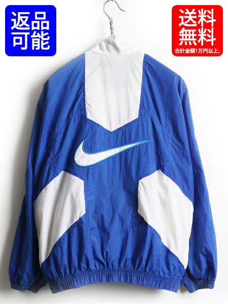 90's ■ ナイキ NIKE ビッグ スウッシュ ロゴ刺繍 2トーン 切替 ナイロン ジャケット ( レディース M メンズ S 程) 古着 ジャンパー 青 白| 【USA古着】中古 90年代 ナイロンジャケット ハイネック ウインドブレーカー ブルー ホワイト フルジップ 男性 女性 男女兼用