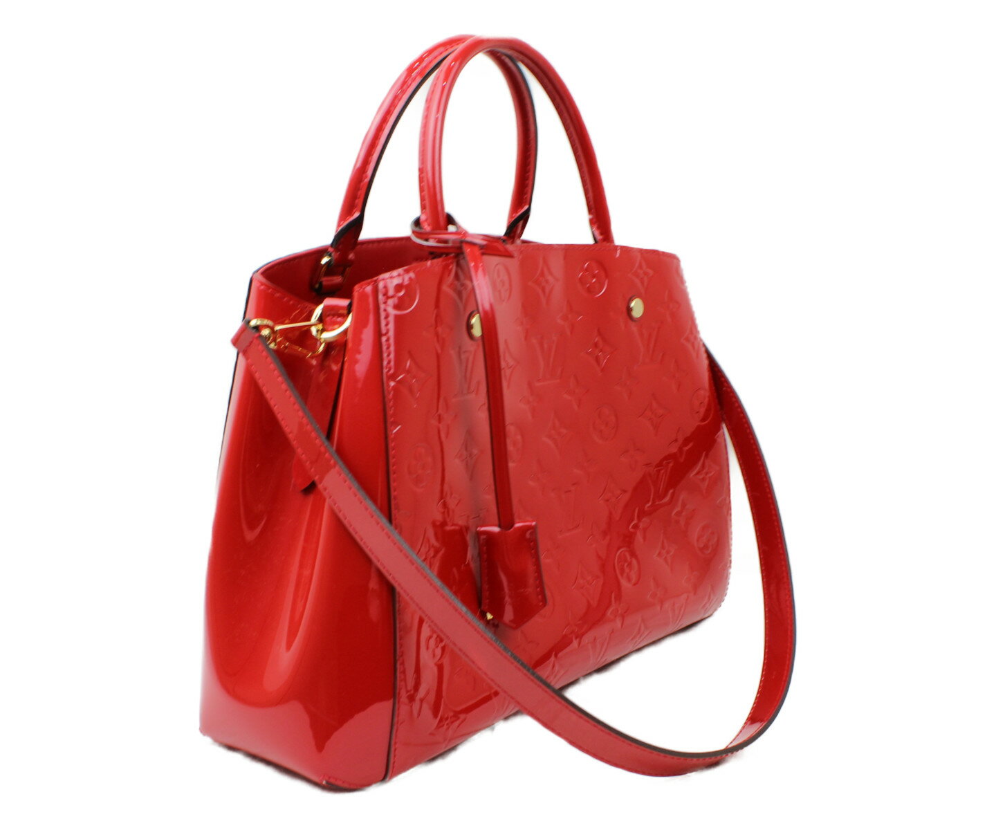 ブランド ルイ・ヴィトン(LOUIS VUITTON) 商品名 モンテーニュMM 型番 M50167 シリアル CA5104 サイズ (約)縦:24cm×横:35cm×マチ:13cm 持ち手:30cm ショルダー:74cm ライン/カラー モノグラム・ヴェルニ/スリーズ 仕様 フック開閉式 内側:オープンポケット×3、ファスナーポケット×1 素材 パテントレザー 参考価格 \338,040 商品ランク 中古A(多少のすり傷や小傷があり、使用感が少なく、中古品としてはきれいな商品。